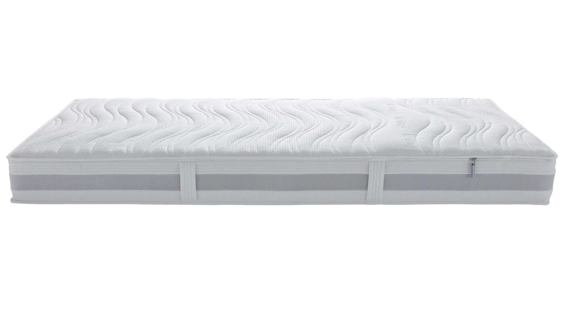 Die verstärkte Beckenzone mit festeren Schaumpolstern sorgt für zusätzliche Stabilität im unteren Rückenbereich. Eine integrierte Sitzkantenstabilisierung erleichtert das Aufstehen und ermöglicht die Nutzung der Matratze auch auf Motorrahmen oder Boxspringuntergestellen.