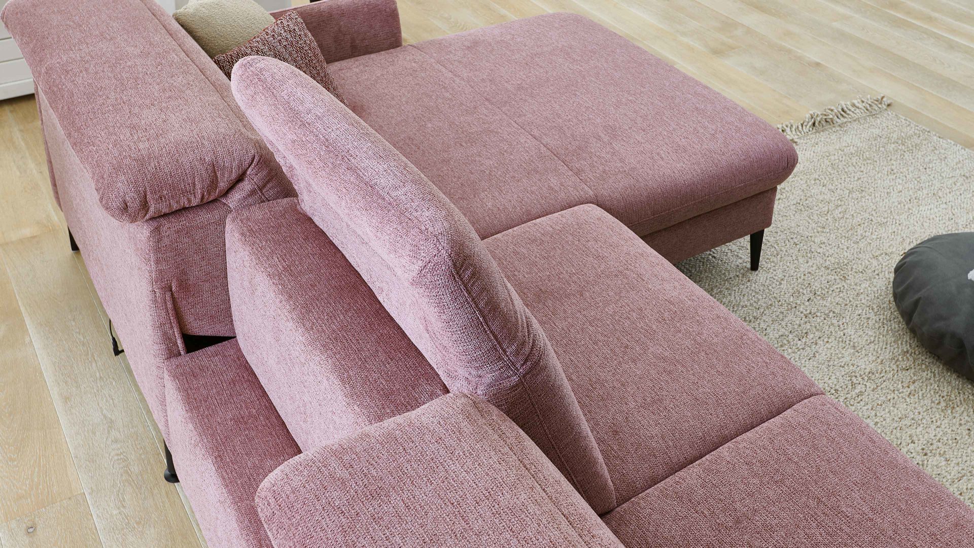 Zu den Highlights des Polsterprogramms gehören die grundsätzlich im Originalstoff bezogenen Rückseiten, die bei allen Elementen enthaltene Kopfpolsterverstellung sowie die für Staubsaugerroboter ideale Bodenfreiheit. Die Serie ist Made in Europe und mit dem Goldenen M ausgezeichnet.