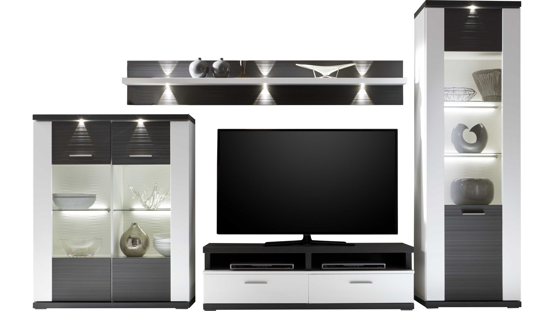 Tolle Wohnwandkombination für Ihr Zuhause: Mit arcticweißen Hochglanzfronten und graphitfarben geschroppten Absetzungen besticht diese raffinierte, fünfteilige Stauraumlösung als Wohnzimmermöbel. Die Korpusse verfügen über arcticweiße Melaminoberflächen, die nicht nur stoß- und kratzfest, sondern auch lichtbeständig sind. Die ca. 330 x 206 x 50 cm (BxHxT) große Wohnkombination besteht aus einer Vitrine mit Glastür, einem Wandboard, einem TV-Unterteil zwei Schubladen sowie einem zweitürigen Highboard, dessen Türen über Glaseinsätze verfügen. In diesen Aufbewahrungsmöbeln bringen Sie Gläser, Vasen, Bücher und Wohnaccessoires ordentlich und staubfrei unter. Ihren Fernseher platzieren Sie mittig auf dem Aufsatz des TV-Unterteils.