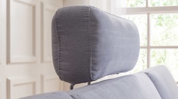 Mit dem hellblauen Veloursbezug Matrix strahlt sie moderne Eleganz aus und harmoniert perfekt mit den Polstermöbeln, die gleich bezogen sind. Die Vorrichtung aus verchromtem Metall, auf der das Kopfpolster befestigt ist, lässt sich auf der Rückenlehne des Sofas variabel einstecken. Der OEKO-TEX® zertifizierte Bezugstoff überzeugt durch seinen samtig weichen Griff und die pflegeleichte Strapazierfähigkeit.