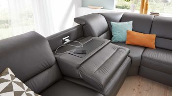 So entsteht eine stabile Ablagefläche, auf der Sie beispielsweise Ihr Notebook oder Mobiltelefon, aber ebenso Getränke und Snacks bequem abstellen können. Gleichzeitig werden die integrierten Funktionsbuchsen frei zugänglich: eine Steckdose sowie ein USB-Anschluss. Die Ablageplatte ist jeweils dem Farbton der Füße angepasst, um eine harmonische Optik zu gewährleisten.