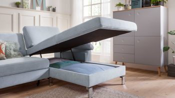 Die gesamte Sitzfläche der Recamiere des SOFAkultur Ecksofas SK 239 lässt sich nach oben aufklappen.