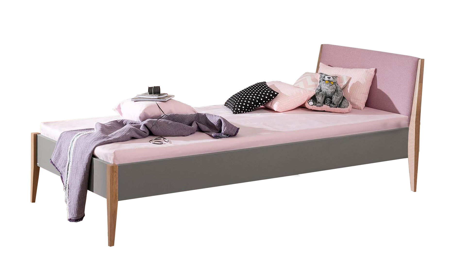 Das hochwertige PAIDI Bettgestell Sten kombiniert massive Eiche mit schiefergrauen Melaminoberflächen und einem dunkelrosa stoffbezogenen Polsterkopfteil. Letzteres zeichnet sich durch seine angenehme Haptik sowie den Anlehnkomfort aus, den es beim Sitzen im Bett bietet.