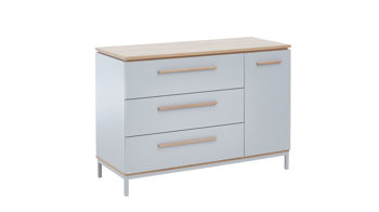 Darüber hinaus lässt sich die Kombikommode mit einem Wickelaufsatz erweitern und folglich als Wickelkommode einsetzen. Alternativ bietet der Oberboden Platz für eine Lampe oder dekorative Elemente wie eine Vase und einen Bilderrahmen mit einem persönlichen Foto Ihrer Familie oder eines wichtigen Menschen. Auf ca. 135 x 96 x 57 cm (BxHxT) belaufen sich die Maße des Kommodenschranks.